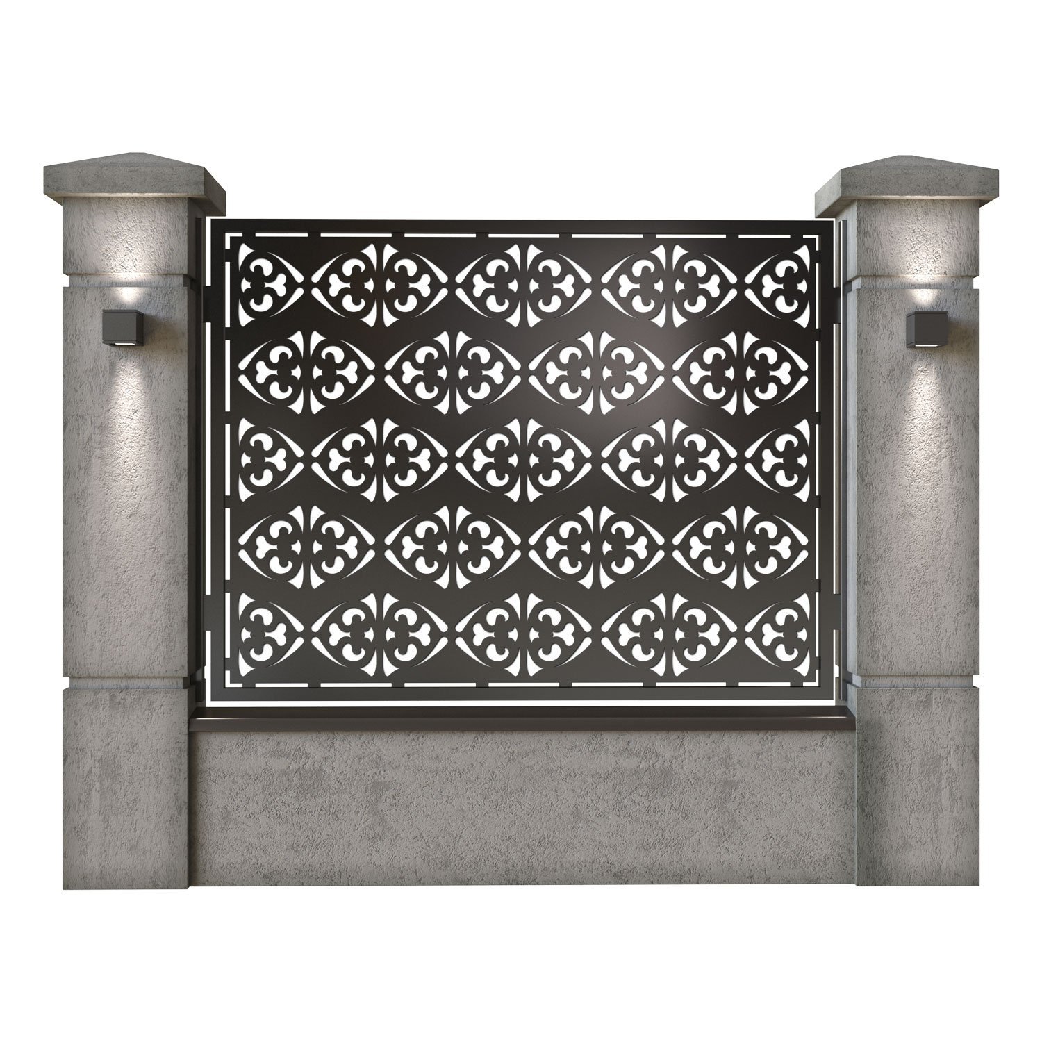 Panou de gard metalic din tabla debitata CNC, model Art Deco. Rama panoului este realizata din teava rectangulara tip lis (lisa), 40×30 mm, avand grosimea de 2 mm.