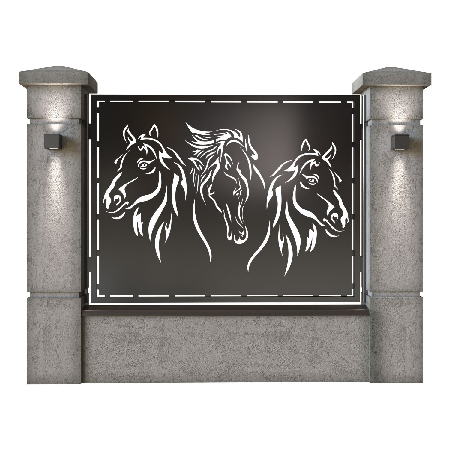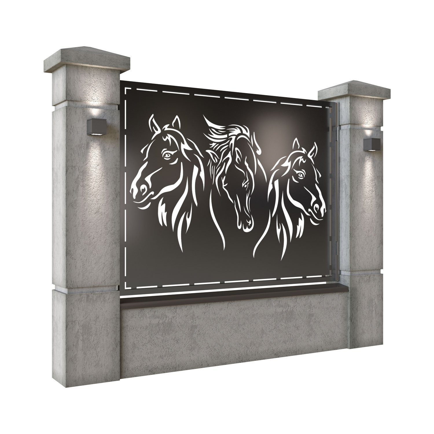Panou de gard metalic din tabla debitata CNC, model Cal (Cai). Rama panoului este realizata din teava rectangulara tip lis (lisa), 40×30 mm, avand grosimea de 2 mm.