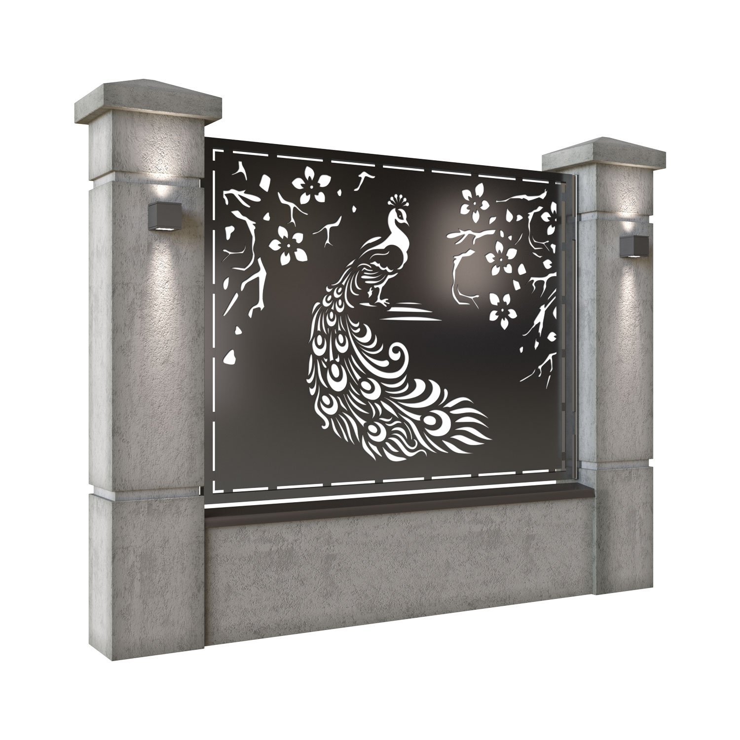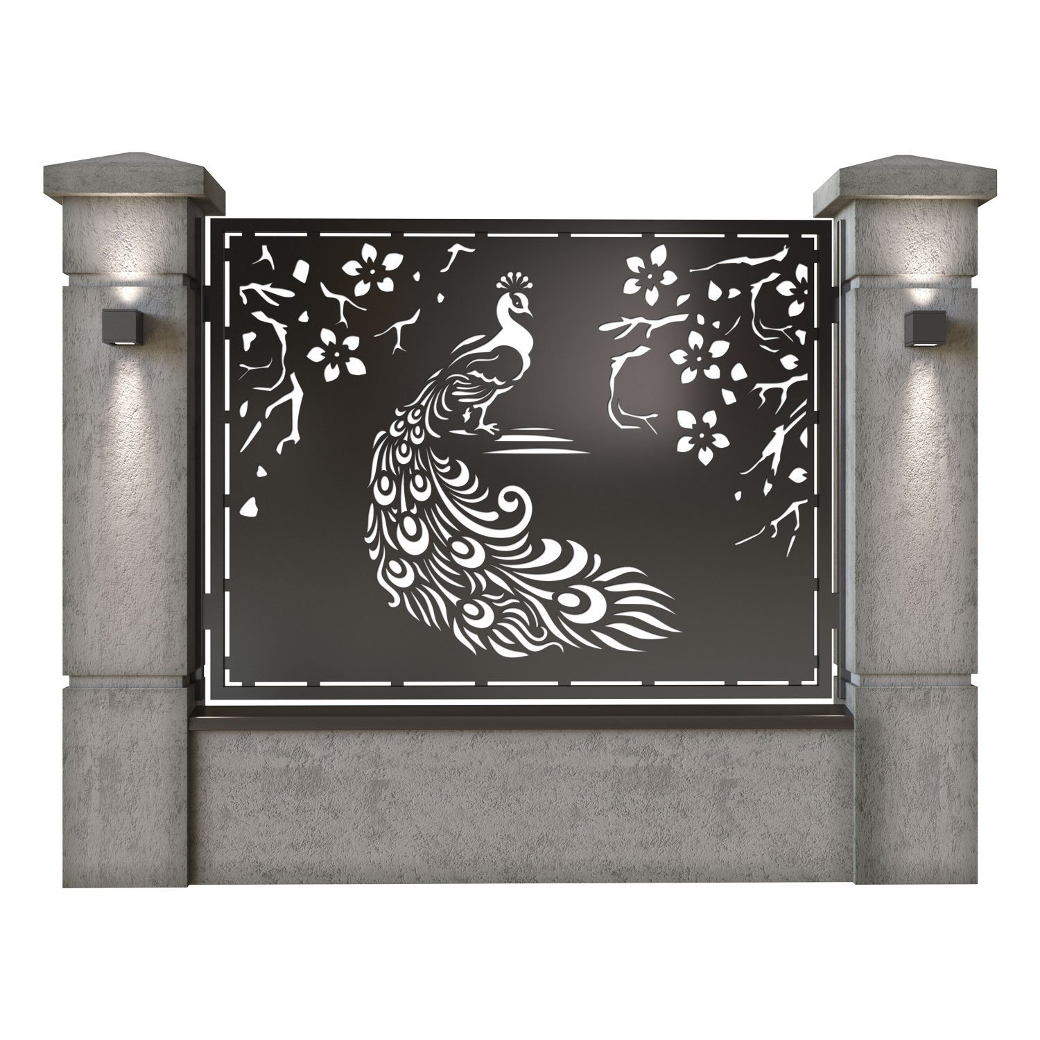 Panou de gard metalic din tabla debitata CNC, model Pauni. Rama panoului este realizata din teava rectangulara tip lis (lisa), 40×30 mm, avand grosimea de 2 mm.