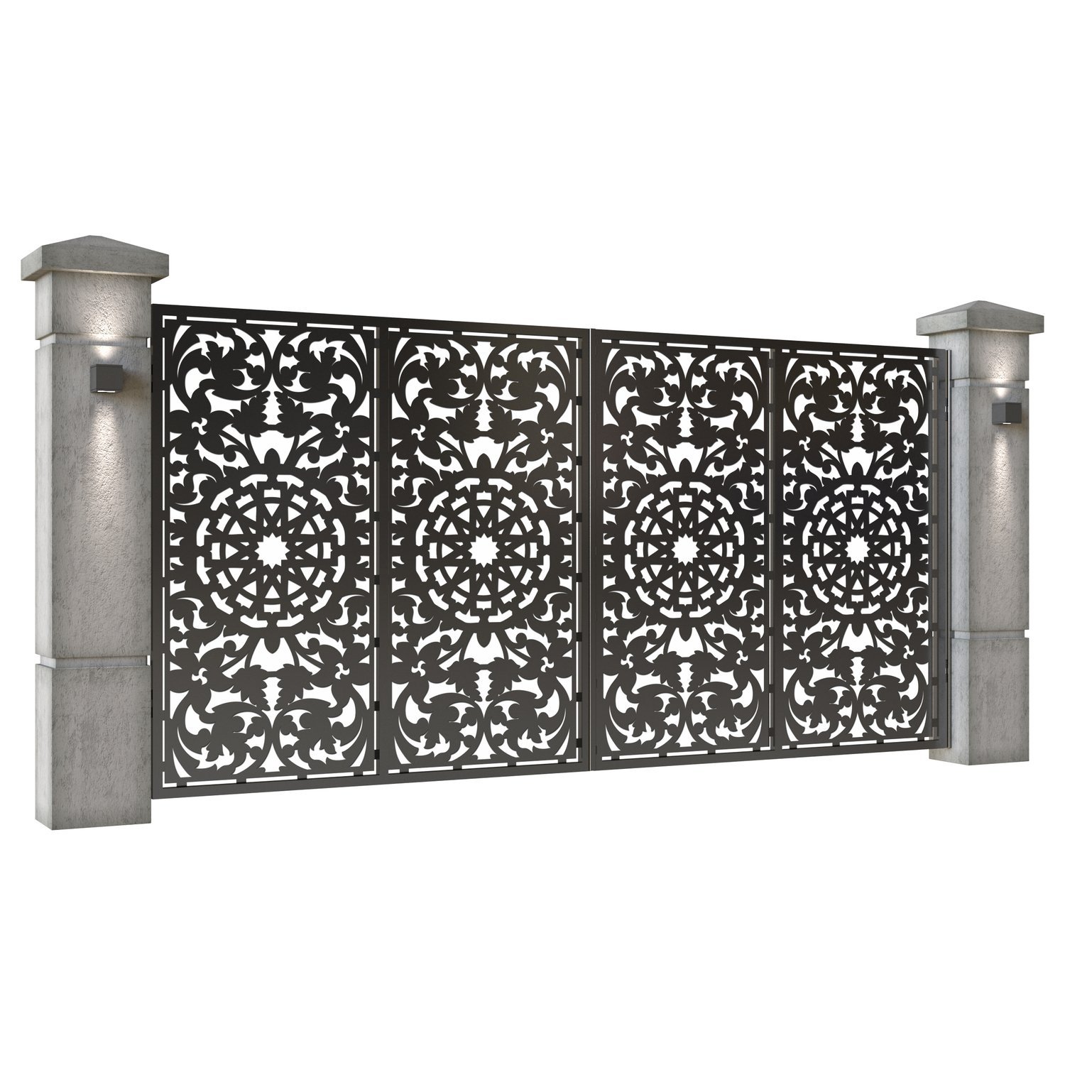 Panou de gard metalic din tabla debitata CNC, model Oman. Rama panoului este realizata din teava rectangulara tip lis (lisa), 40×30 mm, avand grosimea de 2 mm.