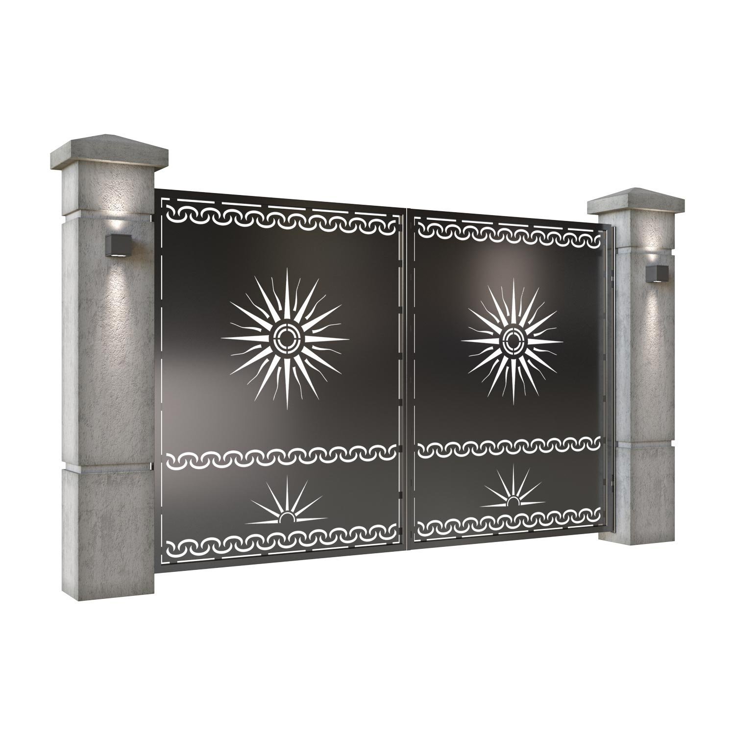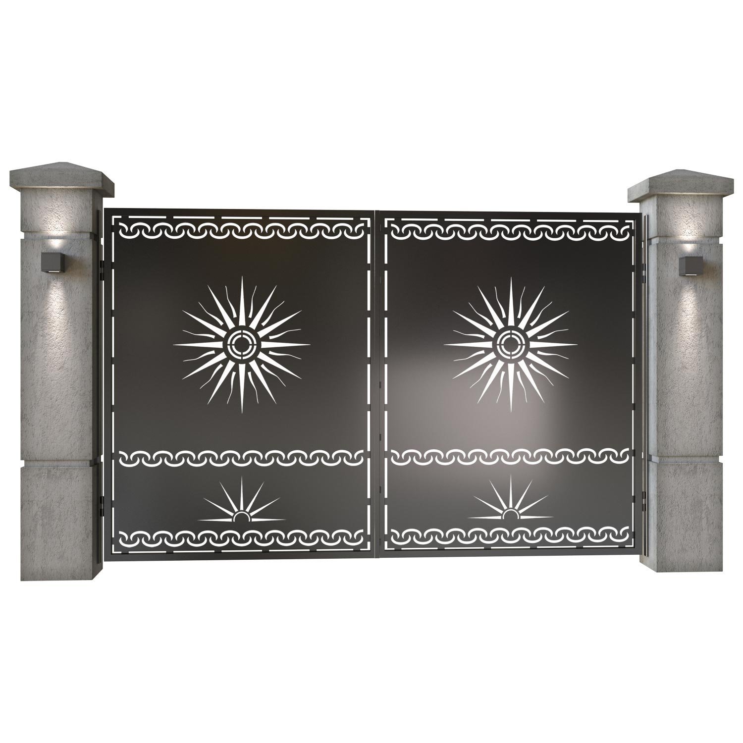 Panou de gard metalic din tabla debitata CNC, model Soare. Rama panoului este realizata din teava rectangulara tip lis (lisa), 40×30 mm, avand grosimea de 2 mm.